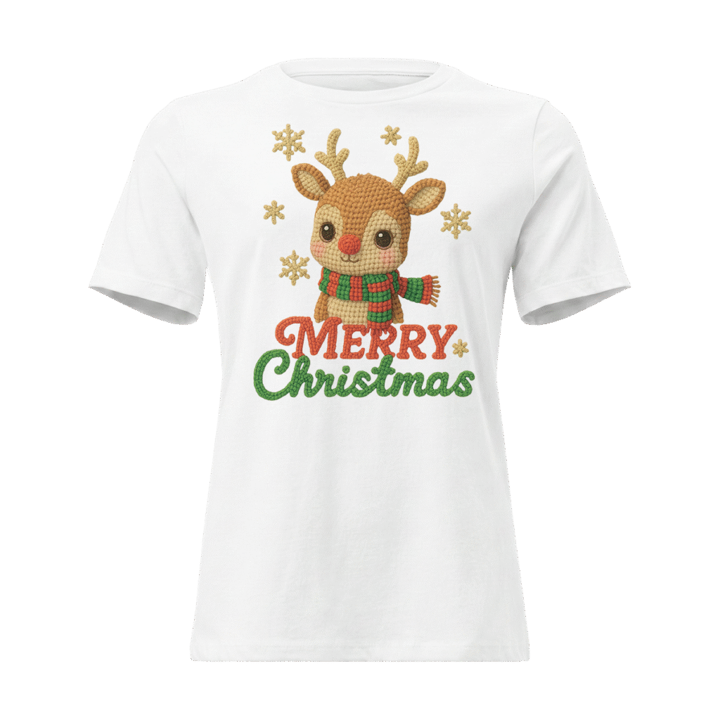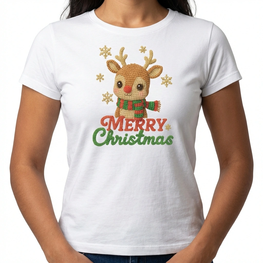 Añade un toque de ternura a tus fiestas con nuestra camiseta exclusiva de Navidad. El diseño presenta un reno súper detallado con un efecto visual de textura tejida (estilo crochet) que evoca la calidez de lo hecho a mano, pero con la suavidad y durabilidad de un estampado de alta calidad. Es la prenda perfecta para las fotos familiares de Nochebuena, para abrir regalos o simplemente para disfrutar del espíritu navideño con total comodidad.