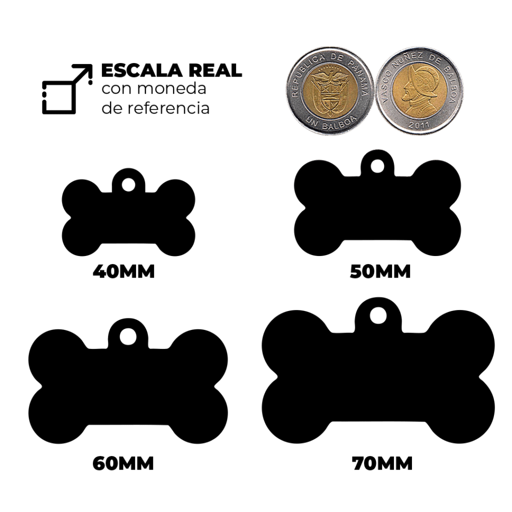 Nuestras plaquitas están diseñadas para ser lo suficientemente visibles como para cumplir su función, pero también ligeras y cómodas para tu mascota. Para que te hagas una idea, su tamaño es comparable a una moneda de 1 Balboa, ideal para perros y gatos de todas las razas.