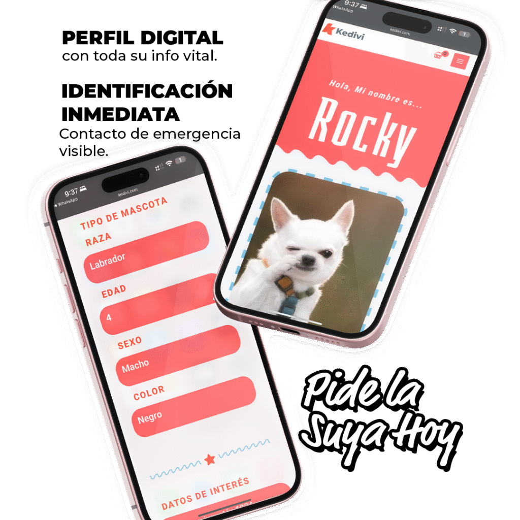 Sabemos que tu mascota es parte de la familia. Perderla, aunque sea por un minuto, es una pesadilla. Por eso creamos la Plaquita de Identificación Inteligente Kedivi, la forma moderna de asegurar su regreso a casa.